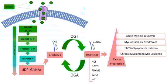 O-linked β-D-N-acetylglucosamine (O-GlcNAc) modification is a post-translational modification (PTM) targeting a variety of proteins located in the nucleus, plasma, as well as mitochondrion named O-GlcNAcylation [10,11,12,13]. Highly dynamic reversible changes in O-GlcNAcylation are tightly regulated by the sole pair of O-GlcNAc transferase (OGT) and O-GlcNAcase (OGA) antagonistic enzymes [14,15]. OGT catalyzes the transfer of N-acetyl glucosamine (GlcNAc) from the donor substrate uridine diphosphate N-acetyl glucosamine (UDP-GlcNAc) to the hydroxyl group of serine (Ser) or threonine (Thr) substrate protein residues [16]. OGA reverses this hydrolytic pathway [17]. In recent years, abnormal OGT and O-GlcNAcylation have often been observed for a variety of malignancies [18]. Moreover, there is increasing evidence that upregulated O-GlcNAcylation has a positive role in immune escape in a variety of cancer cells and regulates the proliferation of tumor cells including colorectal cancer, liver cancer, lung cancer, breast cancer, and even hematological malignancies [19] (as shown in Table 1). For instance, OGT overexpression was observed for pre-B acute lymphoblastic leukemia (pre-B-ALL), and the authors noted that increased OGT-mediated O-GlcNAcylation could exacerbate pre-B-ALL through the phosphatidylinositol 3-kinase (PI3K)/protein kinase B (AKT)/c-Myc cascade [20]. On the other hand, approximately 2–3% of the body’s glucose enters the hexosamine biosynthesis pathway (HBP) and is metabolized in combination with amino acids, nucleotides, and fatty acids to produce the donor substrate UDP-GlcNAc for O-GlcNAcylation [21]. In order to meet their survival and proliferation needs, tumor cells use glycolysis as the main metabolic pathway to obtain ATP and try to compensate energy metabolism through the HBP pathway [22]. In tumor cells, increased glucose flux through the HBP leads to increased UDP-GlcNAc levels, which in turn prompt an overall increase in O-GlcNAcylation [23]. Therefore, O-GlcNAcylation is often referred to as a “nutrient sensor” (as shown in Figure 1) that operates in response to changing nutritional and metabolic needs [24]. Asthana et al. showed that targeting glutamine-fructose-6-phosphate transaminase (GFAT) to inhibit the flux of the HBP could induce the differentiation and apoptosis of AML cells (OCI-AML3 and HL-60) [25], thereby indicating the critical role of O-GlcNAcylation in cancer proliferation.