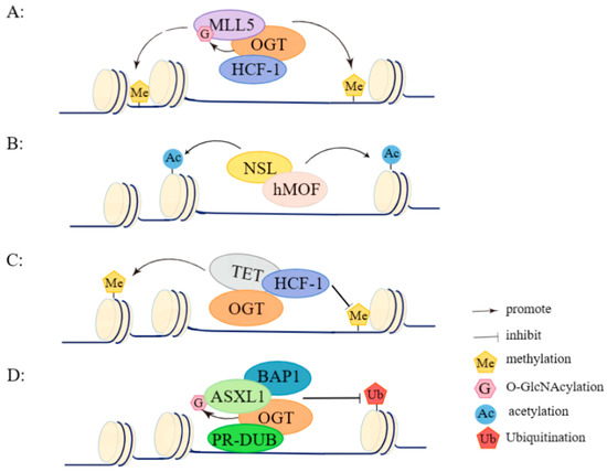 Cancer development and progression are often accompanied by the overexpression of OGT and abnormal overall O-GlcNAcylation, which may drive the life course of cancer cell survival, proliferation, metastasis, and invasion. In cells, OGT is able to assemble with a variety of proteins to form complexes that are involved in the regulation of epigenetic modifications (as shown in Figure 2) to mediate the expression of related genes, thereby influencing the development of hematological malignancies. This review focuses on the complexes formed with the involvement of OGT and their role in the development of hematological malignancies.