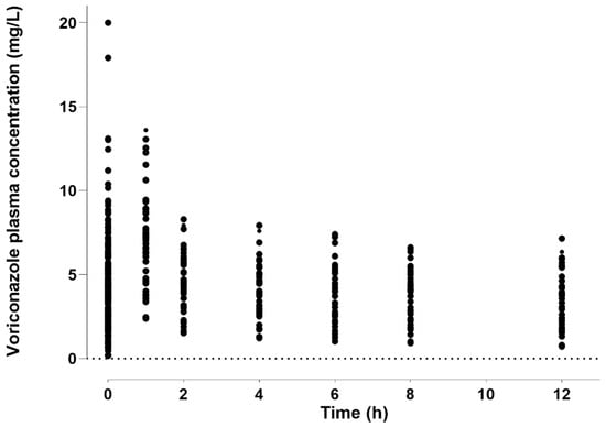 Voriconazole was administered as recommended by clinicians, whether prophylactically, empirically, or based on microbiological outcomes. We did not interfere with the dose or frequency of drug administration. Retrospective trough concentrations were monitored when the doctor deemed it necessary (usually 5–7 d after administration), and prospective samples were collected when the drug concentration reached a stable state. The definition of the voriconazole stable-state trough concentration is as follows: the trough concentration measured after voriconazole loading-dose treatment for >3 d or without loading-dose treatment for >5 d [61,62,63].