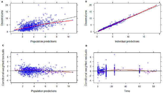 Residual variability was evaluated by the combined error model: Cobs = Cpred × (1 + ε) + ε’, where Cobs and Cpred are the observed and predicted concentrations, while ε and ε’ are random variables distributed with a mean of 0 and variances of σ2 and σ’2, respectively.