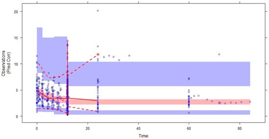 Prediction-corrected VPC (pcVPC) for the final pharmacokinetic model of voriconazole. The blue circles represent the observed data. The middle solid, lower dashed, and upper dashed lines represent the median, 5th, and 95th percentiles for the observed data, respectively. The shaded areas represent a 95% CI for the simulated predicted median, 5th, and 95th percentiles constructed from simulated datasets of individuals from the original data.