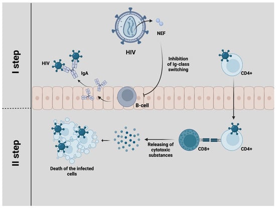 The process of overcoming the mucosal barrier by HIV infection includes several steps. Firstly, the selection of the virus’s genotype occurs; therefore, not all virions will be able to penetrate through the mucous membranes. For instance, B cells, upon activation by mucosal dendritic cells, switch their class to IgA, which can capture and inactivate viral particles that are not associated with cells [14]. Unfortunately, HIV possesses various ways of suppressing the first line of mucosal defense. One hypothesis of an impaired humoral response relates to the impact of HIV-1 Nef on B-cell signaling and the inhibition of immunoglobulin class switching. This proposed mechanism involves the creation of actin-driven cellular conduits, which allows Nef to transit from infected macrophages and dendritic cells to uninfected germinal center B cells and accumulate there, which leads to diminished expression of activation-induced cytidine deaminase, an essential enzyme for class switching. This process is thought to interfere with the normal functioning of B cells and their ability to mount an effective immune response [15,16] (Figure 2).