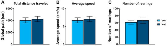 In this study, we first evaluated ketamine’s effects on the locomotion of adolescent mice using the open field test (OFT). We found no statistically significant differences in the total distance traveled (Figure 1A), average speed (Figure 1B) or number of rearings (Figure 1C) between the controls and the ketamine-treated mice.