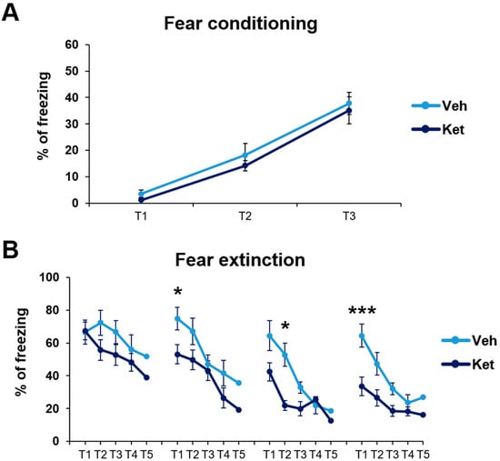 Cued fear conditioning and fear extinction paradigm in vehicle- and ketamine-treated male adolescent mice. (A) Adolescents’ freezing behavior across fear conditioning. (B) Adolescents’ freezing behavior across fear extinction. Data are presented as means ± SEM and were analyzed with two-way RM ANOVA, followed by post hoc Holm–Sidak correction, with conditioning/extinction trials as repeated variables and drug treatment as an independent variable. Statistically significant differences are given as p < 0.05. *; p < 0.001. *** Vehicle (Veh) vs. ketamine (Ket). T1–T5, Trials 1–5.