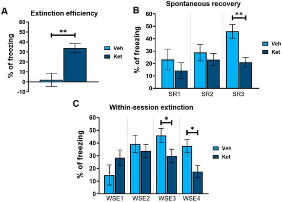 Different FE parameters in vehicle- and ketamine-treated male adolescent mice. (A) FE efficiency, calculated as follows: extinction efficiency = E1T1 − E4T1 ([Ext Day 1, Trial 1] − [Ext Day 4, Trial 1]); (B) spontaneous recovery of fear, calculated as follows: SR1 = E2T1 − E1T5 ([Ext Day 2, Trial 1] − [Ext Day 1, Trial 5]); SR2 = E3T1 − E2T5 ([Ext Day 3, Trial 1] − [Ext Day 2, Trial 5]); SR3 = E4T1 − E3T5 ([Ext Day 4, Trial 1] − [Ext Day 3, Trial 5]); (C) within-session extinction, calculated as follows: WSE1 = E1T1 − E1T5 ([Ext Day 1, Trial 1] − [Ext Day 1, Trial 5]); WSE2 = E2T1−E2T5 ([Ext Day 2, Trial 1] − [Ext Day 2, Trial 5]); WSE3 = E3T1 − E3T5 ([Ext Day 3, Trial 1] − [Ext Day 3, Trial 5]); WSE4 = E4T1 − E4T5 ([Ext Day 4, Trial 1] − [Ext Day 4, Trial 5]). Data are presented as means ± SEM and were analyzed using independent samples t-tests for each extinction day across all behavioral parameters. Statistically significant differences are given as p < 0.05. *; p < 0.01. ** Vehicle (Veh) vs. ketamine (Ket). SR1–SR3, spontaneous recovery 1–3; WSE 1–4, within-session extinction 1–4.