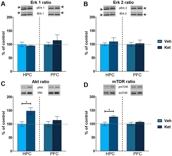 As kinase activity is best represented by the ratio of its phosphorylated to its total form, we focused on the ratio of the respective kinases of the mTOR pathway. Ketamine increased the hippocampal Akt and mTOR ratios compared to those of the controls (Akt ratio: t(6) = 3.33, p < 0.05, Figure 4C; mTOR: t(6) = 3.51, p < 0.05; Figure 4D and Figure S1), with no alterations detected in the PFC. However, we found no significant changes in the extracellular signal-regulated kinase 1 (Erk 1) and extracellular signal-regulated kinase 2 (Erk 2) ratios in either of the two examined tissues (Figure 4A,B and Figure S1).