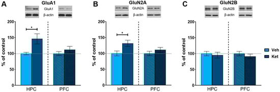 Protein expression of glutamate receptor subunits. Levels of GluA1 (A), GluN2A (B) and GluN2B (C) subunits were detected in the synaptoneurosomal fractions derived from the HPC and PFC of ketamine- and vehicle-treated adolescent mice. Graph values within each tissue are presented as a % of respective controls. Data are presented as means ± SEM and were analyzed with independent samples t-test within each tissue. Statistically significant differences are given as p < 0.05. * Vehicle (Veh) vs. ketamine (Ket). HPC, hippocampus; PFC, prefrontal cortex.