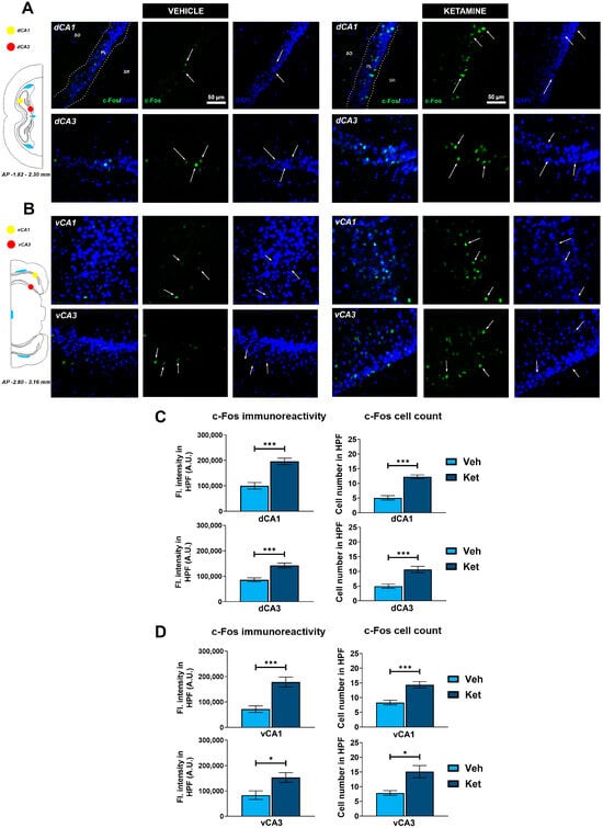 c-Fos expression in the dorsal and ventral hippocampus. Fluorescence staining of c-Fos (green) and DAPI (blue) in the CA1 and CA3 regions of the dorsal hippocampus (dHPC) and ventral hippocampus (vHPC) of vehicle-treated ((A,B), left panel) and ketamine-treated ((A,B), right panel) fear-extinguished adolescent mice. Separate c-Fos and DAPI micrographs were depicted as a confirmation of c-Fos colocalization with DAPI-stained cellular bodies (representative overlaps highlighted with white arrows). Representative graphs for c-Fos immunoreactivity ((C,D), left panel) and the number of c-Fos-labeled cells ((C,D), right panel) are presented as mean values ± SEM and were analyzed using independent samples t-test within each region. Statistically significant differences are given as p < 0.05. *; p < 0.001. *** Vehicle (Veh) vs. ketamine (Ket). dCA1, dorsal CA1 region; dCA3, dorsal CA3 region; vCA1, ventral CA1 region; vCA3, ventral CA3 region.