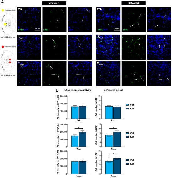 c-Fos expression in the ventromedial prefrontal cortex. Fluorescence staining of c-Fos (green) and DAPI (blue) in the prelimbic (PrL) and infralimbic (IL) areas of the ventromedial prefrontal cortex (vmPFC) of vehicle-treated ((A), left panel) and ketamine-treated ((A), right panel) fear-extinguished adolescent mice. Separate c-Fos and DAPI micrographs were depicted as a confirmation of c-Fos colocalization with DAPI-stained cellular bodies (representative overlaps highlighted with white arrows). Representative graphs for c-Fos immunoreactivity ((B), left panel) and the number of c-Fos-labeled cells ((B), right panel) are presented as mean values ± SEM and were analyzed using independent samples t-test within each region. Statistically significant differences are given as p < 0.05. * Vehicle (Veh) vs. ketamine (Ket). PrL, prelimbic cortex; IL, infralimbic cortex.