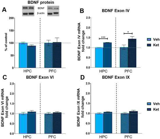 Finally, we explored ketamine’s influence on the protein expression of the most abundant synaptic plasticity marker in the brain, brain-derived neurotrophic factor (BDNF). We found no statistically significant differences in the BDNF levels between the vehicle- and ketamine-treated groups in either the HPC or the PFC of the fear-extinguished adolescents (Figure 8A and Figure S1). Additionally, we looked at the gene expression of several BDNF exons involved in long-term memory processing. Here, we found that ketamine upregulates the expression of BDNF exon IV in both the HPC and PFC following FE in adolescents (HPC: t(6) = 26.8, p < 0.05; Figure 8B; PFC: t(6) = 2.62, p < 0.05; Figure 8B), with no notable alterations observed for either exon VI or exon IX (Figure 8C and 8D, respectively).