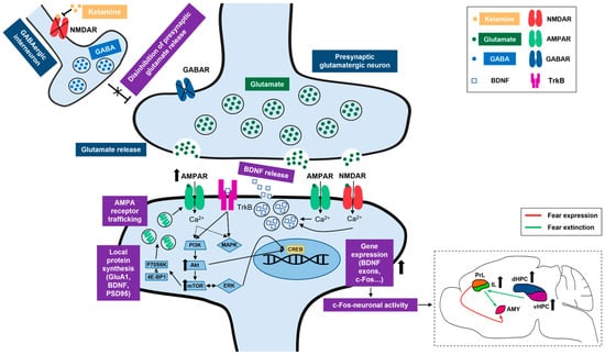 Ketamine, a non-competitive NMDA receptor antagonist, has recently emerged as a promising candidate for relieving anxiety [27,28,29] and significantly reducing the symptoms of PTSD [30,31,32]. Ketamine’s ability to promote the reprocessing of aversive experiences can be attributed to its influence on fear-related learning processes [33,34], as the drug has the capacity to promote structural and functional synaptic plasticity across the fear circuitry [35,36,37]. Ketamine preferentially blocks the NMDARs on GABAergic interneurons in the cortex and HPC [37,38], resulting in the disinhibition of presynaptic glutamatergic neurons, elevated glutamate release and increased activation of postsynaptic AMPA receptors [39,40,41]. Canonically, ketamine also upregulates BDNF expression and activates the mammalian target of rapamycin (mTOR) signaling cascade within these structures [39,42,43,44], thus affecting the molecular signals involved in fear extinction processes.