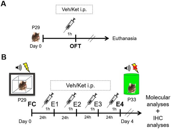 Schematic representation of experimental procedures. (A) Experimental protocol for the open field cohort. (B) Experimental protocol for the fear conditioning/extinction cohort. Abbreviations—P29: postnatal day 29; P33: postnatal day 33; OFT: open field test, Veh: vehicle; Ket: ketamine; FC: fear conditioning; E1–E4: FE days 1–4; IHC, immunohistochemistry.