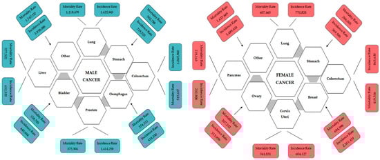Incidence and mortality of different types of male and female cancer worldwide for 2020 estimated by GLOBOCAN 2020. The image is adapted from https://www.uicc.org/news/globocan-2020-new-global-cancer-data, accessed on 15 December 2023.