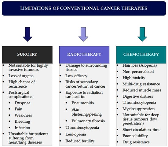 Furthermore, chemotherapeutic agents often cannot penetrate and reach the core of solid tumours, thus failing to kill the cancerous cells [14]. Traditional chemotherapeutic agents are usually cleared from the circulation and are engulfed by macrophages. Therefore, they remain in circulation for a very short time and cannot interact with the cancerous cells, making the chemotherapy ineffective. The poor solubility of the drugs is also a significant problem in conventional chemotherapy, making conventional drugs unable to penetrate the biological membranes [15]. Another major problem in chemotherapy is drug resistance, wherein cancer cells initially suppressed by an anticancer drug develop resistance. This is associated with P-glycoprotein, which is overexpressed on the surface of the cancerous cells and prevents drug accumulation inside the tumour, acting as the efflux pump and often mediating the development of resistance to anticancer drugs [16]. The limitations and drawbacks of conventional anticancer therapies are given in Figure 2.