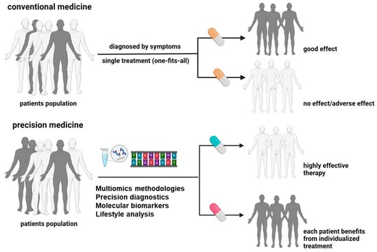 Conventional and precision medicine (PM) approaches have critical differences in classification factors, diagnostics methods, and treatment outcomes (created with BioRender.com).