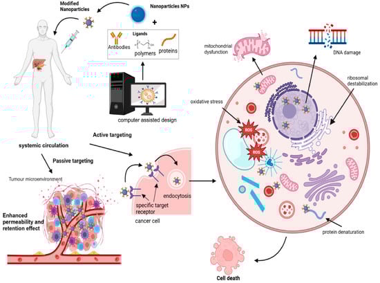 Figure 4 illustrates the two primary mechanisms through which nanoparticles (NPs) achieve targeted delivery in oncology: passive and active targeting. Passive targeting relies on the enhanced permeability and retention (EPR) effect, taking advantage of leaky vasculature and impaired lymphatic drainage in tumours. Active targeting involves the functionalization of NPs with ligands that specifically bind to receptors overexpressed on cancer cells, facilitating precise delivery. This visual representation elucidates the crucial role of NPs in advancing precision medicine approaches for cancer therapy. Several targeting ligands, such as aptamers, small molecules, and antibody fragments, incorporated in NPs bind to overexpressed receptors on cancer cells, increase tumour specificity, and reduce off-target drug toxicities [86]. Moreover, the conjugation of NPs with cancer cell-targeting ligands improves internalisation and receptor-mediated endocytosis [87,88].