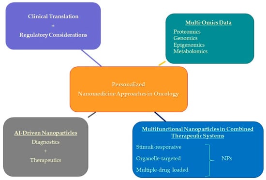 Similarly, the MOSAIC project aims to create a vast repository of spatial omics data in cancer, integrating clinical annotations with advanced profiling techniques to uncover cancer subtypes and identify drug targets and biomarkers [27]. Despite recent FDA approvals heralding a new era in precision cancer medicine, challenges remain in translating these medicines into clinical practice. Limitations such as poor targeting abilities and immunological toxicities hinder seamless integration into established therapeutic protocols [28,29]. Therefore, integrating cutting-edge technologies is essential to enhance the precision and effectiveness of these treatments. One such technology that has shown tremendous potential is nanotechnology. By offering highly selective drug delivery, responding to specific stimuli, and ensuring controlled release, nanotechnology can significantly augment the capabilities of precision cancer medicine.