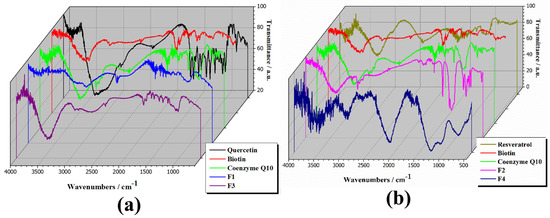 Figure 1 displays the ATR-FTIR spectra of individual components (quercetin, biotin, coenzyme Q10, and resveratrol), formulations with active ingredients (F1 and F2), and final capsule formulations with excipients (F3 and F4).