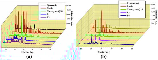 The XRD spectra of bioactive compounds (quercetin, biotin, coenzyme Q10, resveratrol) showed numerous defined diffraction peaks within the range of 5° to 40°, proving their crystalline structure [59]. The characteristic peaks of pure quercetin (Figure 2a) predominantly occur at 2θ values ranging from 6.3° to 7.3°, 10.8°, 12.5°, 13.6° to 14.3°, 15.7° to 18.0°, 24.4°, and 27.3°. These peaks signify the crystalline portion of quercetin [60]. Biotin (Figure 2—red line) exhibited nine characteristic crystal peaks at 2θ values of 8.3°, 9.4°, 11.9°, 17.6°, 18.9°, 21.3°, 22.7°, 28.4°, and 34.3°, along with numerous smaller peaks between 30° and 60°. Consequently, the degree of crystallinity of biotin was notably high [61]. Resveratrol exhibited a distinct crystal morphology at a diffraction angle of 2θ (Figure 2b). Within the range of 10° to 30°, strong characteristic diffraction peaks were evident, specifically at 13.41°, 16.54°, 19.36°, 22.54°, 23.75°, 25.39°, and 28.45°, underscoring its elevated crystallinity [62]. The main diffraction peaks of coenzyme Q10 were detected at 2θ = 11.3, 18.5, 20.2, 22.7, and 23.3 (Figure 2) [54]. These findings align with existing literature, indicating a well-defined crystalline structure and organised atomic arrangement for the active ingredients. However, analysis of the capsule formulations revealed a decrease in peak height and number, with the main characteristic peaks disappearing, suggesting a reduction in crystallinity compared to the pure ingredients. This reduction in crystallinity implies interactions between the active ingredients and the excipients used in the capsules, as anticipated. Importantly, these interactions did not adversely affect the active ingredients. Moreover, the XRD results confirmed the reduction in the crystalline state of the ingredients in the final formulation due to the processing method employed during preparation.