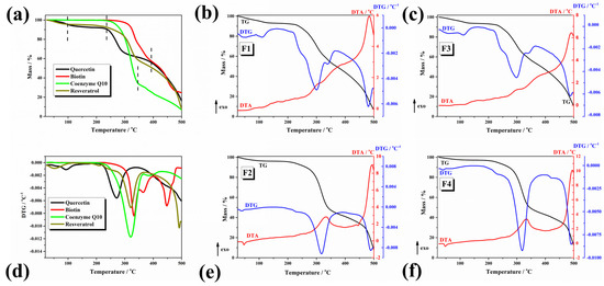 The TG curves of active ingredients exhibit the following thermal behaviour: biotin and coenzyme Q10 show only two major thermal events between 200 and 500 °C, being thermally stable until 200 °C; quercetin and resveratrol show three thermal events: (i) the mass loss can be ascribed to the loss of water; (ii) the last two thermal events are attributed to the combustion of organic components from the samples which occurs from 200 to 250 °C and 250 to 500 °C for both compounds. The thermal behaviour of the F1 and F2 formulations which incorporate only the active ingredients (quercetin, biotin, and coenzyme Q10 for F1 and biotin, coenzyme Q10, and resveratrol for F2) shows mostly the same trend of their thermal decomposition: (i) an initial mass loss until 140 °C for F1 and until 100 °C for F2 due to the loss of volatile compounds (water, solvents); (ii) the second mass loss is a complex one composed by two decompositions steps between 190 and 380 °C for F1 and 180 and 414 °C for F2, which can be ascribed to the combustion of organics. The thermal decomposition events reported for the formulations with excipients (F3 and F4) resemble the thermal behaviour of the formulations which contain only the active compounds with differences in the onset of thermal decomposition and the final residue. If the residue at 500 °C for F1 is 7.45% and for F2 is 9.8%, the corresponding formulations with excipients show a final mass of 11.7% for F3 and 13% for F4, respectively. Taking into account that the excipients are the same and in the same concentration, the different thermal behaviour is due to the presence of quercetin in F3 and resveratrol in F4 [63,64]. The thermal characteristics of the active ingredients and the F1, F2, F3, and F4 formulations and the decomposition steps, respectively, are presented in Table 1.