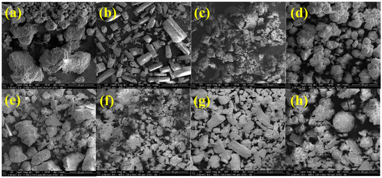 From Figure 4a, quercetin presents an SEM trip-like structure, characterised by a smooth surface lacking distinct features [65]. The SEM image of biotin shows a needle-like crystal structure (Figure 4b). The SEM morphology of coenzyme Q10 (Figure 4c) was observed as a plate shape and crystalline agglomerates [54]. Resveratrol generally has spherical particles with relatively uniform sizes, and few particles are in an aggregated state (Figure 4d) [62]. In contrast, the SEM images of F1 and F2 formulations (Figure 4e,f) reveal the emergence of a novel structure. The complex appears as extremely fine and irregular crystals, showcasing a noticeable reduction in particle size and a partial loss of crystalline properties compared to the initial components. The SEM analysis confirmed the components’ presence and yielded insights into particle shape and size. The captured SEM micrographs of the F3 and F4 formulation (Figure 4g,h) demonstrate the inability to discern the individual component structures, underscoring a robust interaction between active components and excipients.