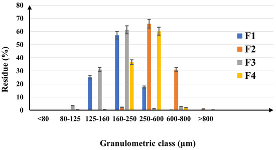Figure 5 shows the histogram representing the particle size distribution for the active ingredient’s mixtures and the powders for capsule filling. All determinations were performed in triplicate. The results are expressed as mean ± SD (standard deviation).