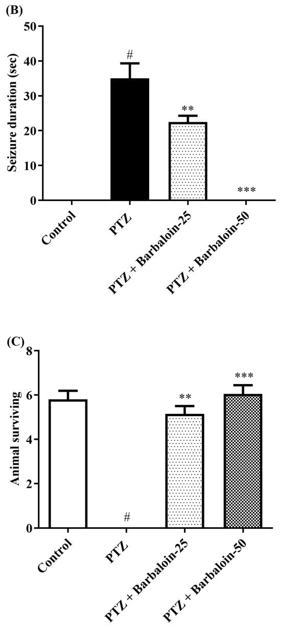 (A–C) Outcome of barbaloin on kindling score. Mean ± S.E.M (n = 6). One-way ANOVA followed by Tukey’s post hoc test (n = 6). # p < 0.001 vs. control, ** p < 0.001, *** p < 0.0001 vs. PTZ.