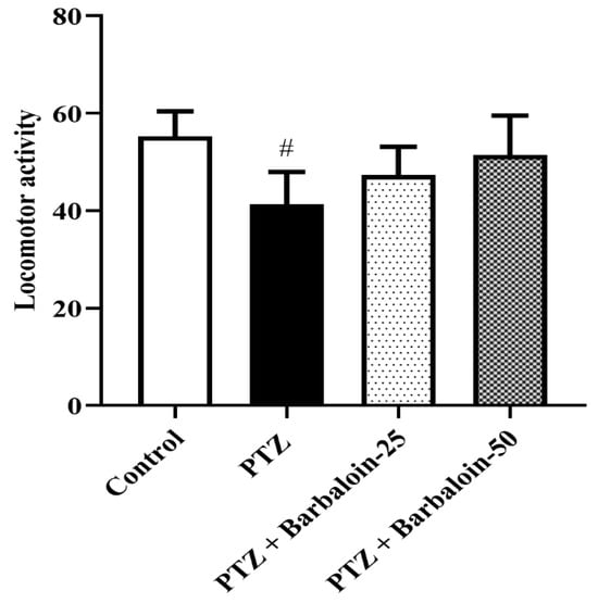 The effect of barbaloin on OFT. Mean ± S.E.M. One-way ANOVA followed by Tukey’s post hoc test (n = 6). # p < 0.001 vs. control.
