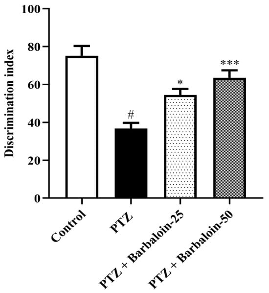 PTZ control rats displayed a significantly decreased discrimination index in comparison to normal control rats (p < 0.0001). Treatment with barbaloin enhanced the discrimination index [F (3, 20) = 16.87, p < 0.0001] compared to PTZ control rats (Figure 3).