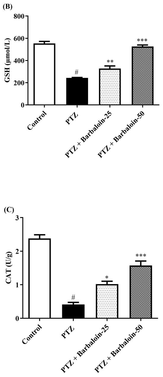 (A–C) The effect of barbaloin on SOD, GSH, and CAT levels. Mean ± S.E.M. One-way ANOVA followed by Tukey’s post hoc test (n = 6). # p < 0.001 vs. control, * p < 0.05, ** p < 0.001, *** p < 0.0001 vs. PTZ.