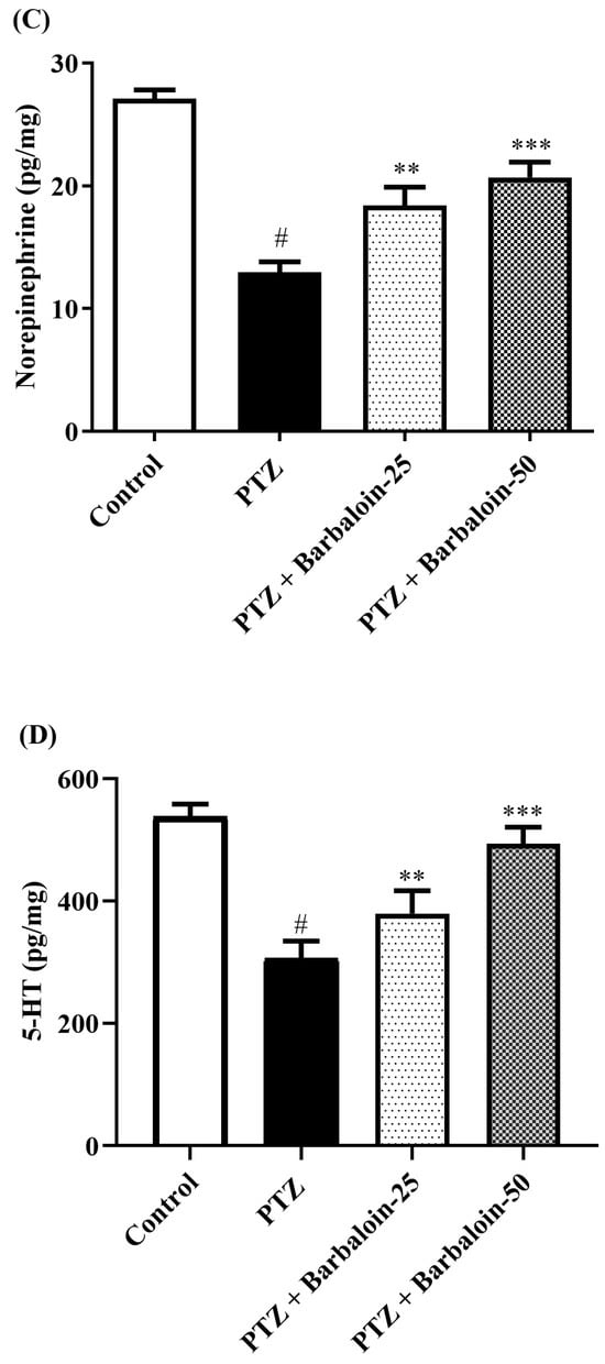 (A–D) The effect of barbaloin on GABA, DA, NE, and 5-HT levels. Mean ± S.E.M. One-way ANOVA followed by Tukey’s post hoc test (n = 6). # p < 0.001 vs. control, * p < 0.05, ** p < 0.001, *** p < 0.0001 vs. PTZ.