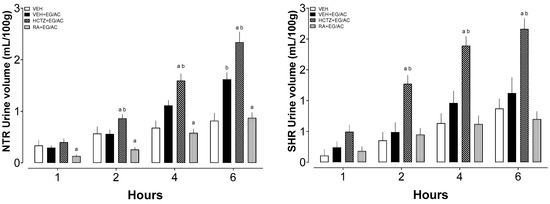 Immediately after the last day of treatment (10 days), the diuresis experiment was conducted (Figure 1). In NTRs, it can be observed that HCTZ+EG/AC group presented increased diuresis from the second hour onward when compared with both the VEH and VEH+EG/AC groups. The RA+EG/AC group remained as the VEH group, showing that it restored the initial conditions of the animals, possibly preventing the damage caused by EG/AC ingestion. In SHRs, only the HCTZ+EG/AC group showed an increase in diuresis from the second hour onward when compared with both the VEH and VEH+EG/AC groups.
