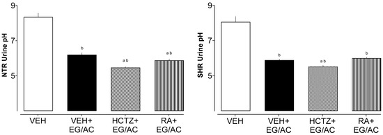 Urine pH of the NTR and SHR animals. a: p < 0.05 compared with the VEH+EG/AC group; b: p < 0.05 compared with the VEH group.
