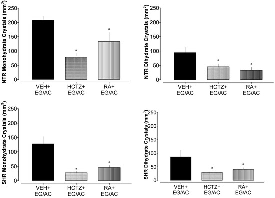 Crystals in the urine of the NTR and SHR groups treated with HCTZ or RA. a: p < 0.05 compared with the VEH+EG/AC group.
