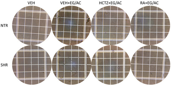 An aliquot of the urine collected from the diuresis experiment was utilized to observe the formation, identification, and counting of crystals under the microscope, as depicted in Figure 3 and Figure 4. An intensive formation of calcium oxalate crystals was observed in the untreated NTR and SHR groups (VEH+EG/AC), as anticipated from the utilized model. Both the HCTZ+EG/AC- and RA+EG/AR-treated groups were effective in diminishing the formation of crystals, of both formats, when compared with the VEH+EG/AC group, suggesting the ability of these treatments to prevent urolithiasis.