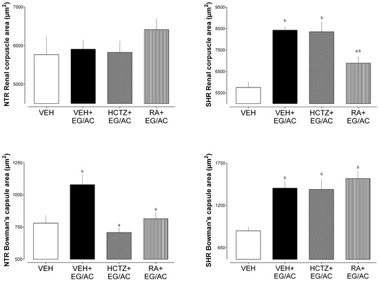 Renal corpuscle areas and Bowman’s capsule areas measured at 40× augmentation in both animal groups. a: p < 0.05 compared with the VEH+EG/AC group; b: p < 0.05 compared with the VEH group.