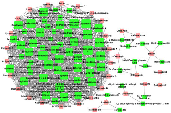 The Tanimoto coefficient of similarity (Tc) was calculated between 36 Epimedium compounds known for their anti-osteoporosis effects and another 80 compounds that had not been previously reported in the literature to possess such activity. Compounds with an average Tc greater than 0.4 were suggested to have potential anti-osteoporosis activity, resulting in a total of 731 compound–compound interaction pairs (Supplementary Table S3). A potential active compound–compound interaction network was constructed based on these pairs (Figure 1), with 33 compounds (pink nodes) known for their anti-osteoporosis effects that were mainly at the edge of the network, and 65 potentially active compounds (green nodes) that were mainly at the center of the network. Among the 65 potentially active compounds, approximately 75% are flavonoids, with the rest comprising acids, lignans, sterols, and other types of compounds.