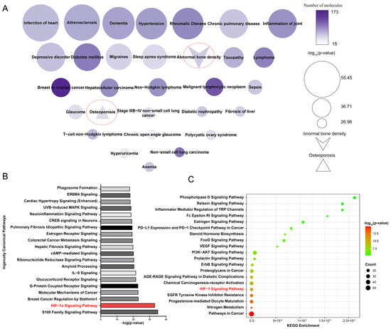 Ingenuity Pathway Analysis (IPA) enrichment analysis identified 487 pathways linked to the potential target proteins, which were ranked by significance according to their -log p values, with the top 20 pathways shown in Figure 2B. Additionally, the Kyoto Encyclopedia of Genes and Genomes (KEGG) pathway analysis tool was used to perform enrichment analysis on the same potential target proteins (Figure 2C). We analyzed the pathways identified by both the IPA and KEGG enrichment analyses. Among the top five enriched pathways, the HIF-1α signaling pathway was the only one that overlapped. Existing studies have reported the association between the HIF-1α signaling pathway and osteoporosis. Yan et al. [22] found that resveratrol can promote osteoblast formation by inhibiting the ROS/HIF-1α signaling pathway to treat hypoxia-induced osteoporosis. Meng et al. [23] found that HIF-1α in B cells can increase osteoclast formation while the deletion of HIF-1α in B cells can alleviate ovariectomized (OVX)-induced bone loss. Therefore, the HIF-1α signaling pathway is very likely the pathway regulated by Epimedium in exerting its anti-osteoporosis effects.