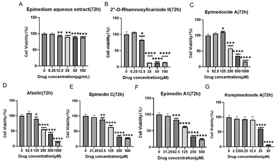 Effects of Epimedium aqueous extract and candidate monomers treatment for 72 h on the viability of MC3T3-E1 cells. Data shown as mean ± standard error of the mean (SEM) (n = 3). Statistical significance is indicated by * p < 0.05, ** p < 0.01, *** p < 0.001, and **** p < 0.0001 compared to the control group, which is at drug concentration of 0 μg/mL in panel (A) and 0 μM from panels (B–G).