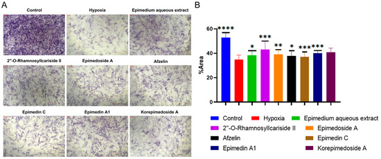 We conducted Alkaline Phosphatase (ALP) staining to assess the effect of potential active compounds in Epimedium on osteoblast differentiation with a MC3T3-E1 cell model. In the hypoxic environment, compared to the hypoxia group, the control group showed a significant increase in ALP activity, and treatments with Epimedium aqueous extract, 2″-O-RhamnosylIcariside II, Epimedoside A, Epimedin A1, and Korepimedoside A all significantly increased the ALP activity. Of these, the 2″-O-RhamnosylIcariside II treatment showed the most significant increase (Figure 4A,B, p < 0.05). These results showed that osteoblast differentiation was inhibited in hypoxia while aqueous Epimedium extract and the potential active compounds in Epimedium, except Korepimedoside A, could protect osteoblast differentiation in hypoxia, especially 2″-O-RhamnosylIcariside II.