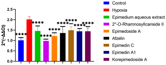 Effects of aqueous extract and potential active compounds on the expression of the HIF-1α gene during osteogenic differentiation of MC3T3-E1 Cells in hypoxia with the hypoxia group as the negative control. The internal reference was β-actin. Data shown as mean ± SEM (n = 3). Statistical significance is indicated by **** p < 0.0001 compared to the hypoxia group.