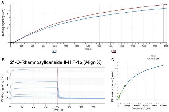 The BLI assay was conducted to explore the binding affinity between 2″-O-Rhamnosylicariside II and HIF-1α. A streptavidin (SA) sensor was used to immobilize biotinylated HIF-1α protein (10 μg/mL). The results showed that the immobilization signals from two repeated tests exceeded 4 nm, demonstrating successful biotinylation (Figure 6A). This helps to increase protein loading, thereby improving the success rate and accuracy of the BLI assay. Super streptavidin (SSA) sensors were then used to immobilize the HIF-1α protein for testing its binding affinity with 2″-O-RhamnosylIcariside II across a concentration range of 0.625–10 mg/mL. The results showed that 2″-O-RhamnosylIcariside II could bind with the HIF-1α protein, with the binding signal strength being positively correlated with the concentration (Figure 6B). A dynamic fitting curve indicated an affinity (KD) of 36.84 μM, supporting the hypothesis that HIF-1α is the target protein of 2″-O-rhamnosylirariside II (Figure 6C).