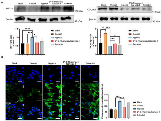 The western blot results also showed that HIF-1α protein levels in the hypoxia group were upgraded compared to the control group, while there was no significance in HIF-1α protein expression between the blank group and control group (Figure 7A, p < 0.05). And treatment with 2″-O-RhamnosylIcariside II significantly reduced HIF-1α protein expression, while estrogen treatment had no significant effect (Figure 7A, p < 0.05). The immunofluorescence assays exhibited similar results to the Western blot, showing a significant increase in the fluorescence intensity of the HIF-1α protein in the hypoxia group compared to the control group and no significance between the blank group and the control group (Figure 7B, p < 0.05). Subsequently, following treatment with 2″-O-RhamnosylIcariside II, there was also a significant decrease in the fluorescence intensity of the HIF-1α protein while estrogen treatment had no significant effect on regulating the HIF-1α protein in hypoxia (Figure 7B, p < 0.05). Therefore, these results indicate that, under hypoxic conditions, 2″-O-RhamnosylIcariside II can promote the osteogenic differentiation of MC3T3-E1 cells by promoting COL1A1 protein expression and inhibiting HIF-1α protein expression.