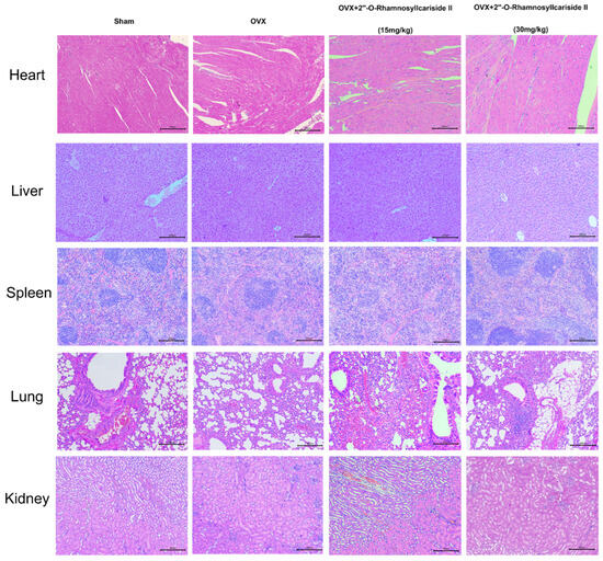 Histological analysis of mouse tissue samples for evaluating the in vivo safety of 2″-O-RhamnosylIcariside II. H&E staining across five different tissue types from Sham, OVX, and OVX mice treated with 2″-O-RhamnosylIcariside II at doses of 15 mg/kg and 30 mg/kg. Scar bar is 200 μm.