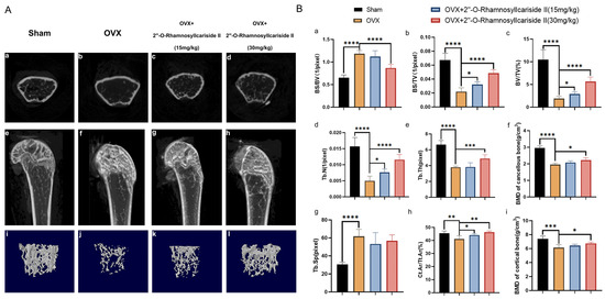 Micro-CT analysis was employed to evaluate the treatment effect of 2″-O-RhamnosylIcariside II on the cancellous bone and cortical bone of OVX mice by scanning the area 2 mm above the femoral epiphyseal and on the shaft from 1/3 to 1/2 mm below the femoral epiphyseal, respectively. The comparative Micro-CT imaging results depicted in Figure 9A(a,b,e,f,i,j) revealed a bone loss in the OVX group when contrasted with the Sham group, suggesting successful induction of the osteoporotic model. Subsequent administration of 2″-O-RhamnosylIcariside II can improve the bone microstructure deterioration (Figure 9A(b,d,f,h,j,l)).