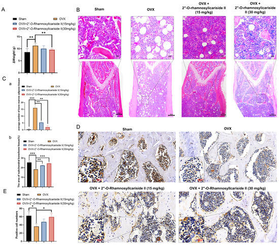 Osteoporosis is often accompanied by the abnormal accumulation of bone marrow adipose tissues [37,38]. The H&E staining results revealed a significant increase in bone marrow adipose tissues in the OVX group compared to the Sham group (Figure 10B,C(a), p < 0.05). Additionally, 2″-O-RhamnosylIcariside II significantly reduced bone marrow adipose tissue in a dose-dependent manner compared to the OVX group (Figure 10C(a), p < 0.05). The H&E staining results also demonstrated that 2″-O-RhamnosylIcariside II significantly increased the subchondral bone trabeculae in a dose-dependent manner compared to the OVX group (Figure 10C(b), p < 0.05). These findings were consistent with previous Micro-CT analysis and weight assessment, suggesting that 2″-O-RhamnosylIcariside II effectively reduced bone marrow adipose tissues in the femur and improved the subchondral bone trabeculae in a dose-dependent manner, thereby treating osteoporosis.