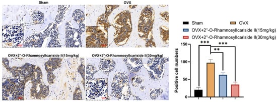 Immunohistochemical analysis of the effect of 2″-O-RhamnosylIcariside II treatment on HIF-1α protein expression in the femur of OVX mice. ** p < 0.01, *** p < 0.001 indicate a statistically significant difference compared to the Sham group. Scar bar is 20 μm in partial enlarged images and 50 μm in original images, respectively.