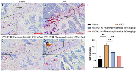 TRAP staining analysis of the effect of 2″-O-RhamnosylIcariside II treatment on osteoclasts in vivo. (A) Sham group. (B) OVX group. (C) OVX + 2″-O-RhamnosylIcariside II (15 mg/kg) group. (D) OVX + 2″-O-RhamnosylIcariside II (30 mg/kg) group. (E) The number of osteoclasts per unit area in each group. Scar bar is 20 μm in partial enlarged images and 200 μm in original images, respectively. The data are presented as the mean ± SEM (n = 3), ** p < 0.01 indicates a statistically significant difference compared to the OVX group.