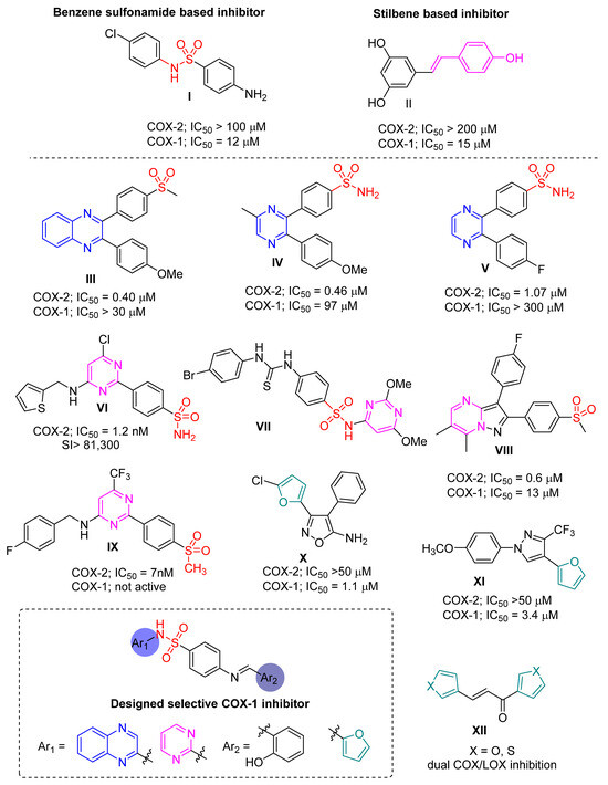The tested compounds displayed IC50 values ranging from 0.71 to 4.82 μM against COX-1 and IC50 values ranging from 9.26 to 15.24 μM against COX-2. Their selectivity indices for COX-1 ranged between 2.87 and 18.69. Fortunately, it was found that the designed compounds showed, collectively, a selective COX-1 inhibition range superior to the celecoxib for standard compounds I and II. Compound 12 was identified as the most active sulfonamide analogue among the designed compounds with 20, 16.9, and 21 folds compared to the reference (the celecoxib, standard compounds I and II). The chemical structure of compound 12, having a quinoxaline/furan scaffold-based Schiff base sulfonamide, was the best in the reactivity order 12 > 10 > 13 > 11. Therefore, the compounds could be considered promising lead molecules and selective COX-1 inhibitors.