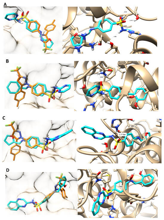 Binding dispositions of the co-crystallized ligand: celecoxib (orange-colored) and the docked compounds (cyan-colored) towards platelet COX-1 active site. (A): 10, (B): 11, (C): 12, and (D): 13. The panel on the left shows the surface representation while the right panel shows the interactive binding mode with the main amino acids.